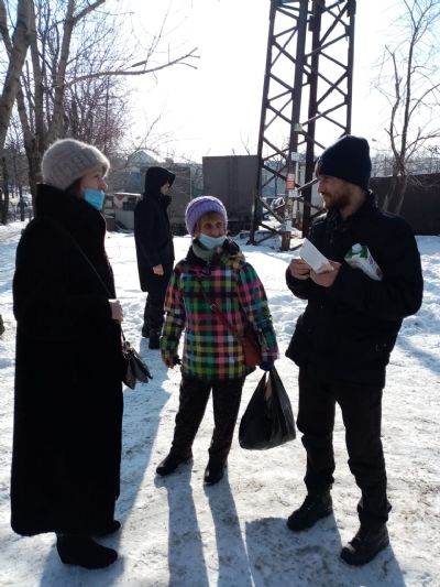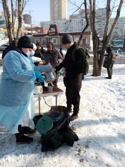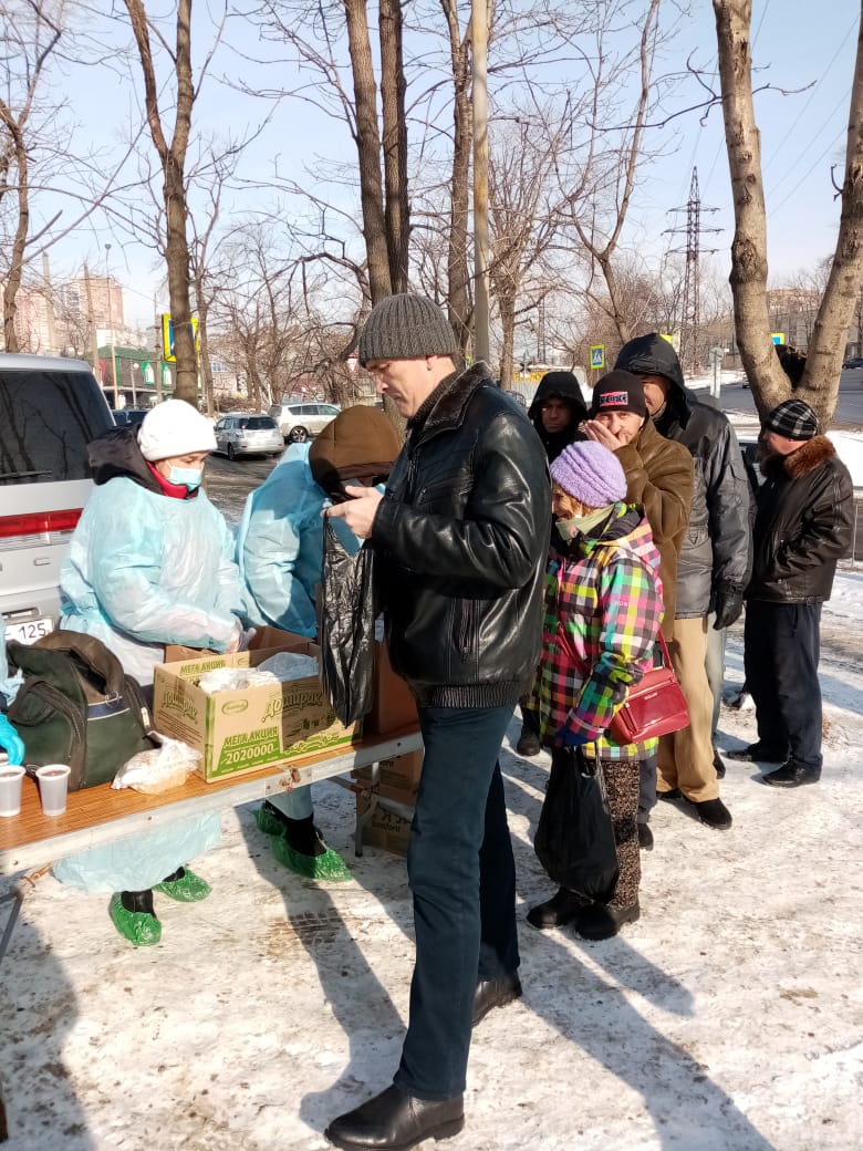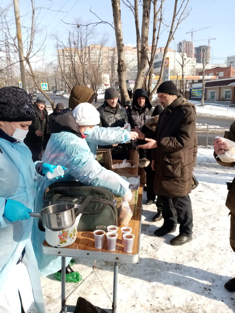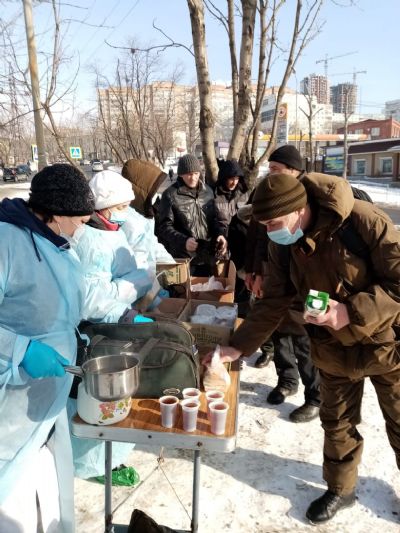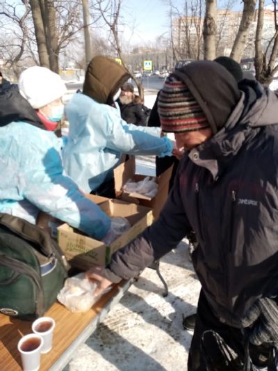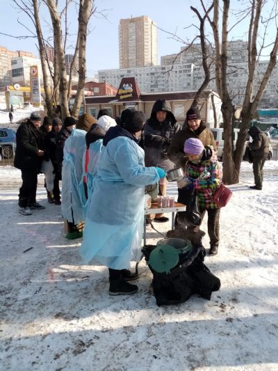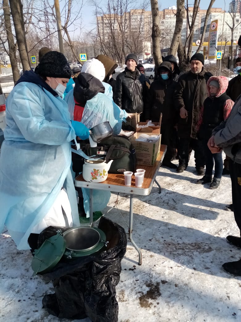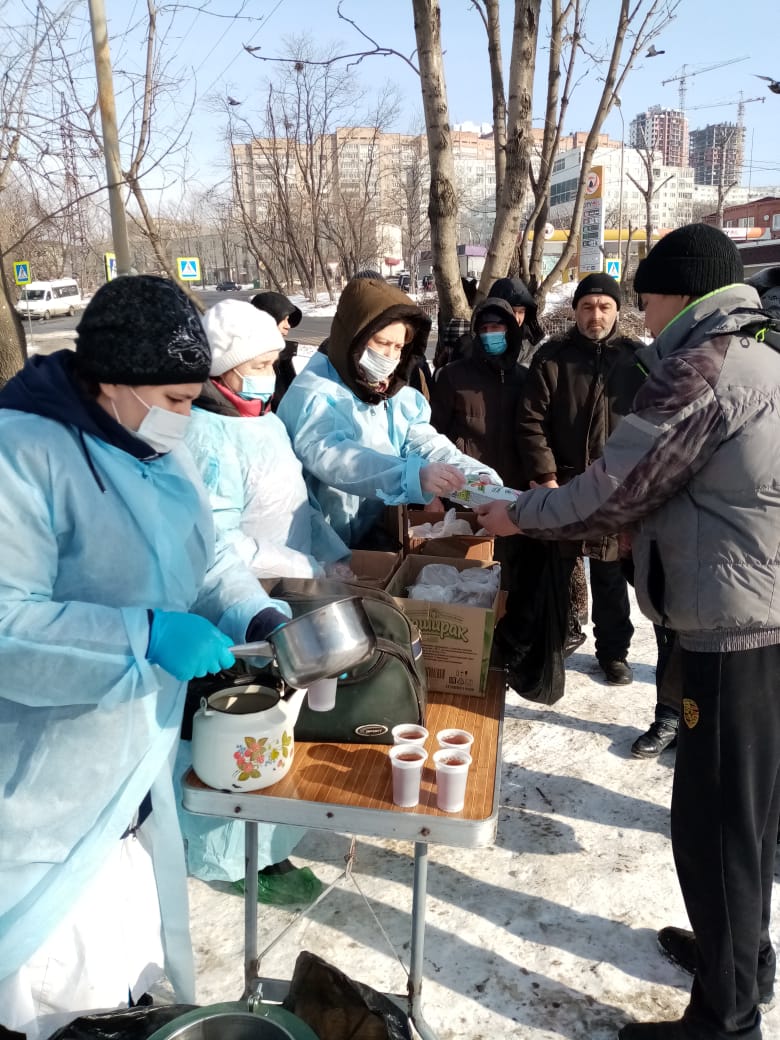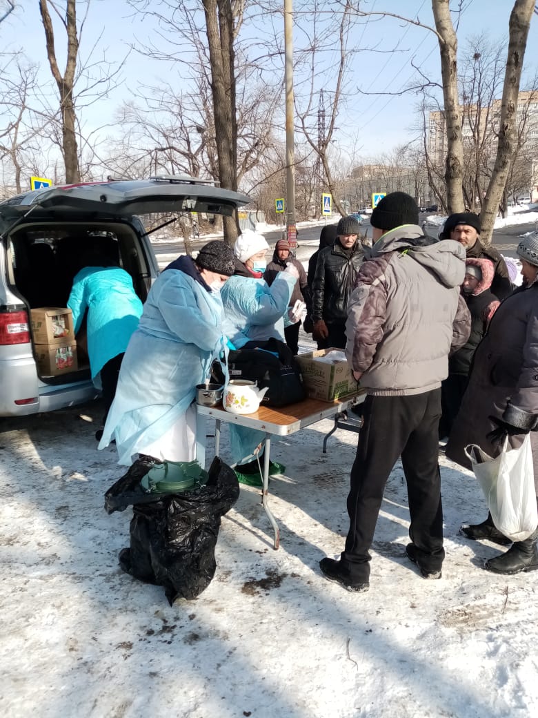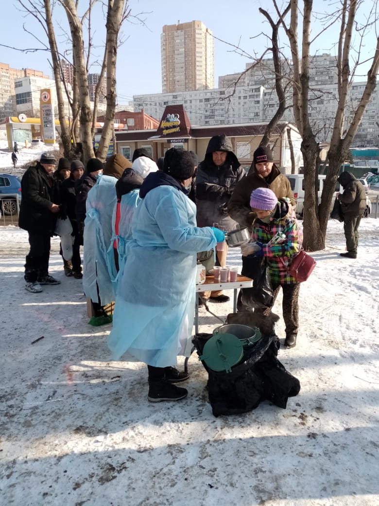 Община «Милосердие» при храме Успения г.Владивосток более 10 лет регулярно кормит бездомных горячими обедами. 5 раз в неделю в любую погоду. С начала пандемии горячие обеды заранее фасуются в «ланч-боксы», чтобы минимизировать время раздачи. С 2020 года в «паек» добавились соки от Фонда продовольствия «Русь» (J7 и Фруктовый сад»).