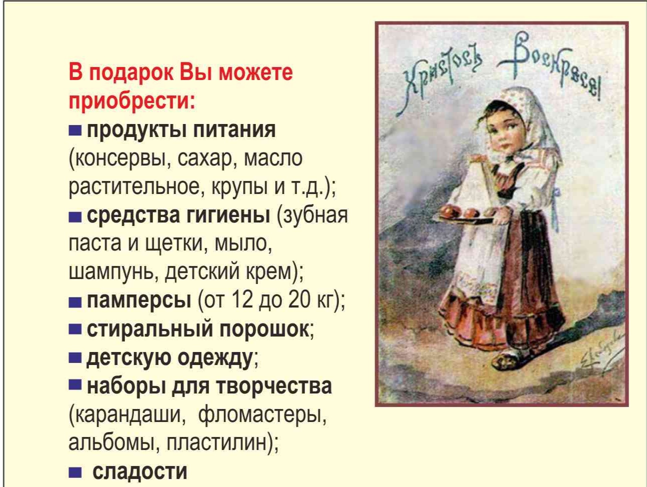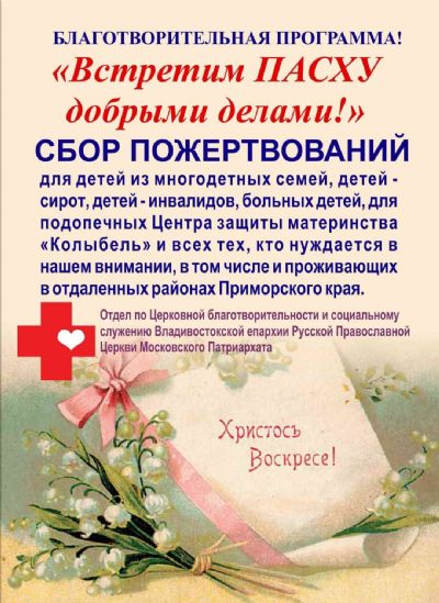 Служба добровольцев «Милосердие» готовится поздравить с Пасхой более тысячи нуждающихся. Для этого мы запускаем традиционную благотворительную программу «Встретим Пасху добрыми делами» по сбору средств на пасхальные подарки для детей-сирот, одиноких инвалидов и стариков, бездомных, пациентов больниц, которые будут вынуждены встретить Пасху не дома.