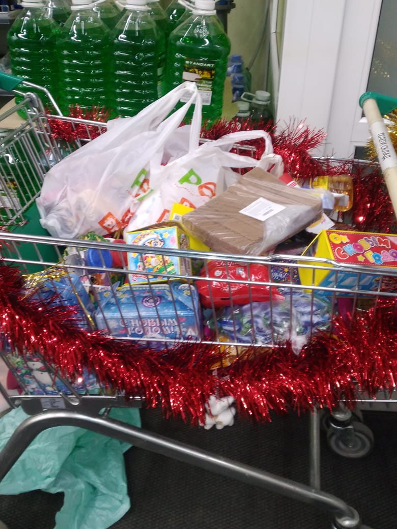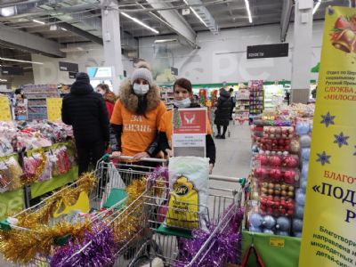 В подарок для детей-сирот, многодетных семей, одиноких престарелых людей и людей, попавших в трудную жизненную ситуацию, можно приобрести сладости, продукты средства гигиены, канцтовары и на выходе из супермаркета положить их в корзину Службы «Милосердия».