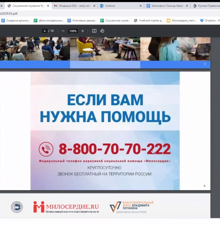Открыл встречу пресс-секретарь Синодального отдела по благотворительности Василий Рулинский. В ней также приняли участие сотрудники пресс-службы Синодального отдела по благотворительности, отдела по связям с общественностью и отдела благотворительных программ московской православной службы помощи «Милосердие». Участники встречи обсудили информирование о церковной помощи беженцам и пострадавшим мирным жителям, информационную поддержку важнейших общецерковных мероприятий в сфере социального служения, работу в социальных сетях в изменившихся условиях.
