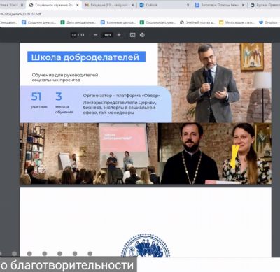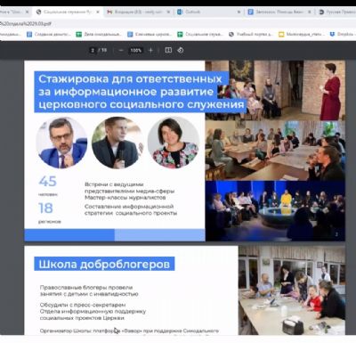 Пресс-секретарь Синодального отдела по благотворительности рассказал участникам встречи о состоявшейся в ноябре 2021 года в Москве первой стажировке для ответственных за информационное развитие церковной благотворительности. В ней приняли участие руководители и представители церковных социальных проектов, пресс-служб и социальных отделов епархий. Участники стажировки встретились в неформальной атмосфере с руководителями федеральных телеканалов, фондов, журналистами, медиа-менеджерами, специалистами по социальным сетям. Также отмечалось, что в декабре 2021 года проходила «Школа Доброблогеров». В обучении приняли участие православные блогеры, а также специалисты по социальным сетям общественно-церковных и церковных благотворительных организаций из разных регионов.