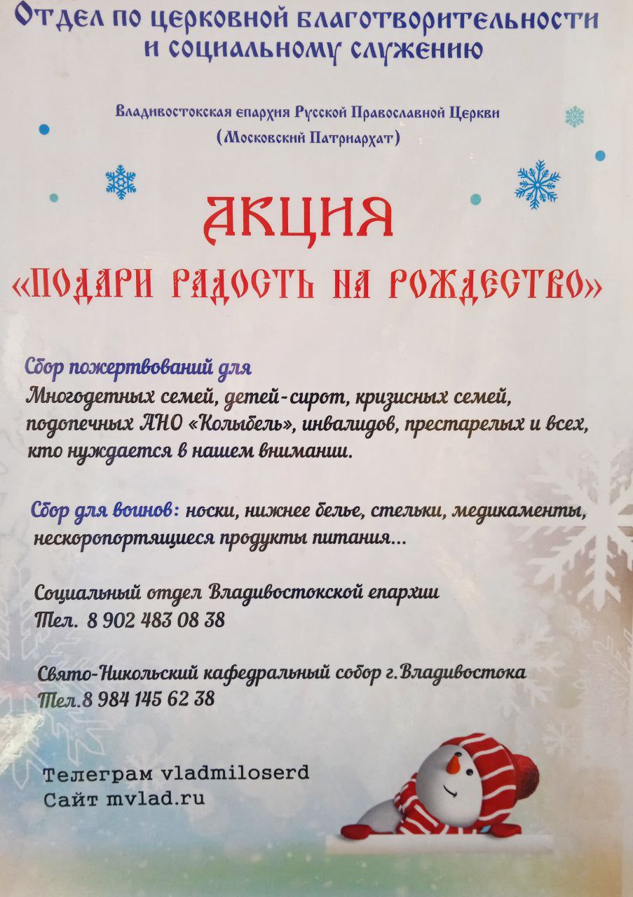В Свято-Никольском кафедральном соборе г.Владивостока (ул.Махалина, 30) и Покровском соборе (Океанский проспект, 44) установлены корзины для сбора подарков для детей из кризисных семей, малоимущих, инвалидов, многодетных семей, одиноких мам, престарелых, а также для бездомных.