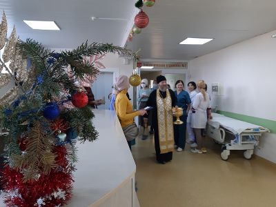В воскресенье, 14 января 2024 г., ДВОМЦ ФМБА России посетил представитель Владивостокской Епархии — настоятель храма новомучеников и исповедников Церкви Русской, руководитель направления семьи и материнства протоиерей Андрей Метелев с прихожанами храма. Целью визита стали святочные дни, которые идут после Рождества Христова и во время которых священнослужитель навещает людей, которые болеют и не могут самостоятельно прийти в храм.