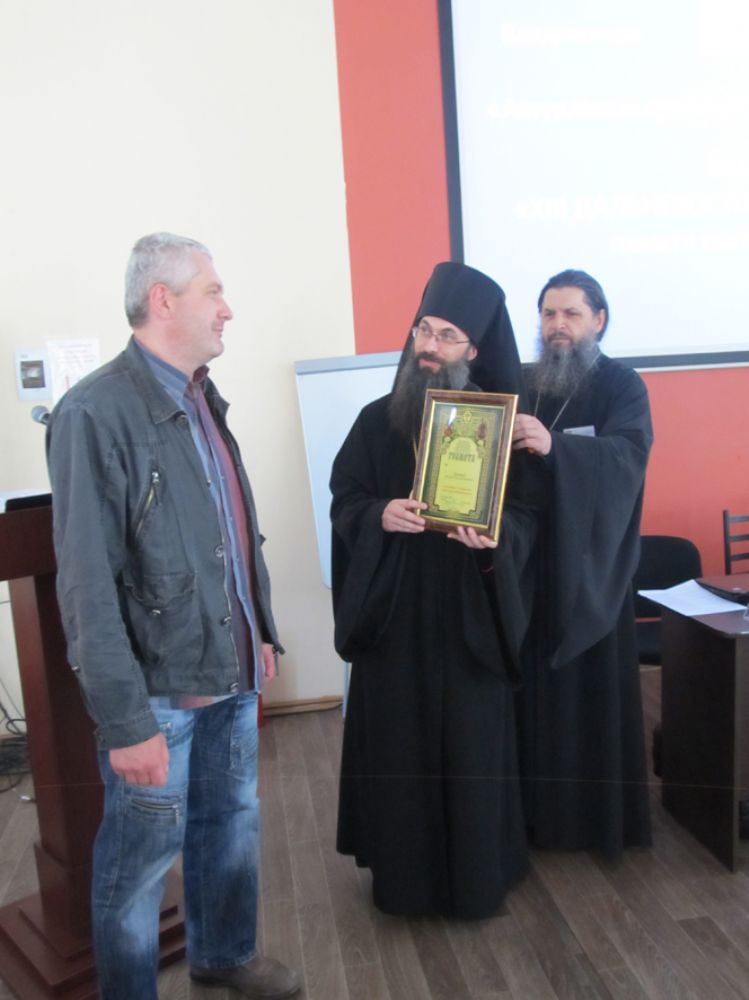 Перед началом обсуждений владыка Иннокентий вручил благодарственные грамоты настоятельнице Марфо-Мариинской обители милосердия игумении Марии за деятельность сестричества обители и врачу Приморского онкологического диспансера А.А. Денежу за труды по открытию хосписа в крае.