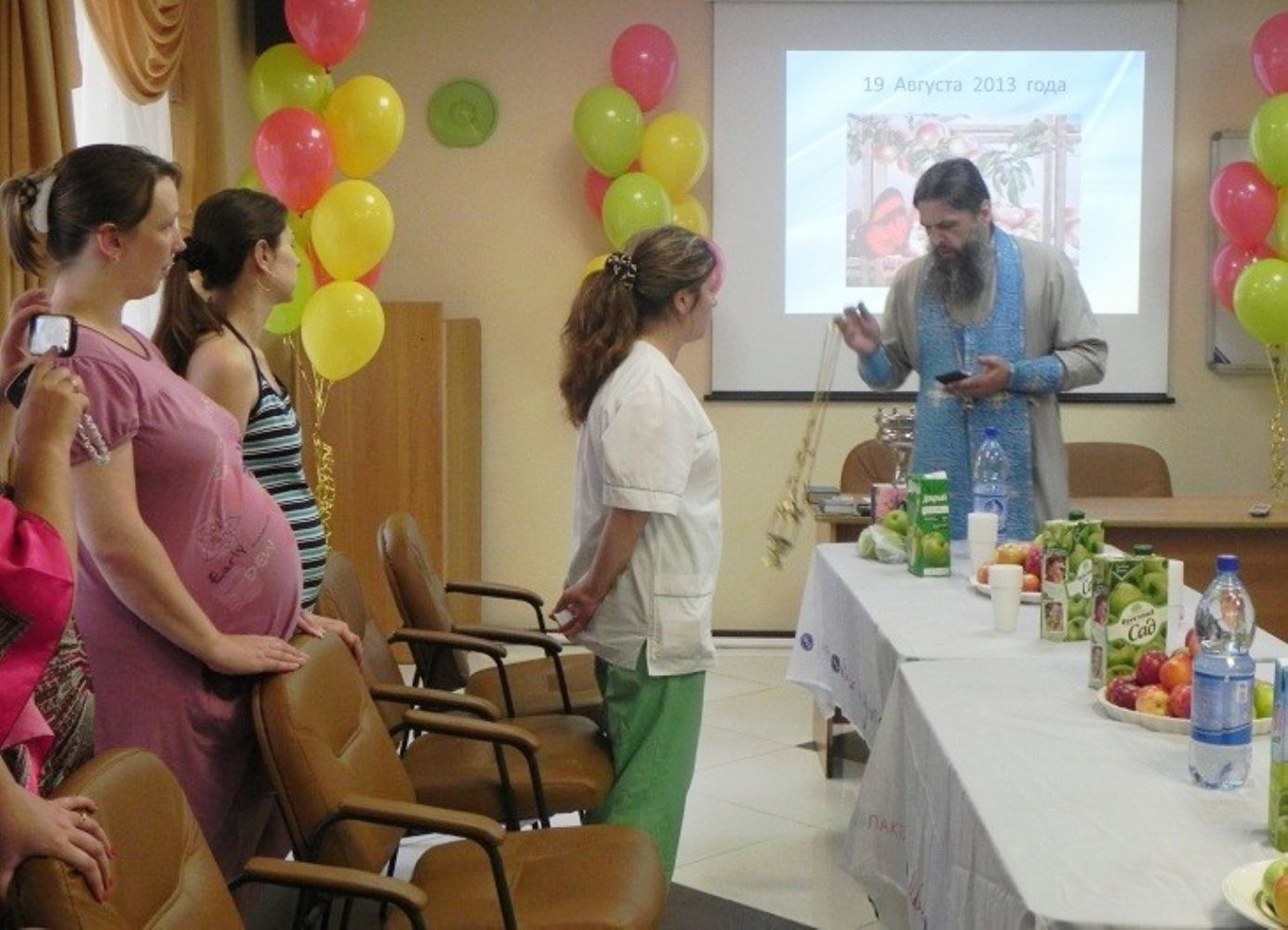 Праздник собрал вместе духовенство, медперсонал и будущих мам. Был совершен молебен, состоялось освящение яблок. Желающие смогли получить от священника благословение на роды.