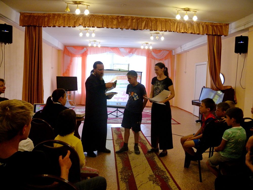Подготовленные к нашему приезду сочинения о здоровом образе жизни читали вслух. Дети дружно включались в обсуждение. Чтобы детям было интересно, мы провели нашу встречу в форме конкурса, и конечно же каждый получил сладкий приз, за что большое спасибо протоиерею Александру Талько, руководителю епархиального отдела по церковной благотворительности и социальному служению.