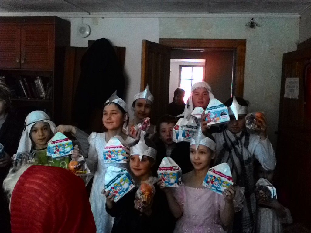 малоимущим семьм с детьми — 18 наборов (продукты), 26 сладких подарков;