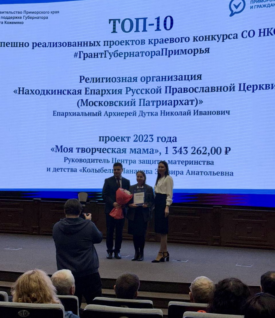 В ходе церемонии руководителю проекта «Моя творческая мама» Паначевой Эльвире Анатольевне были вручены диплом и памятный знак победителя ТОП-10 социальных проектов Приморского края, победивших в конкурсах СО НКО (социально ориентированных некоммерческих организаций).