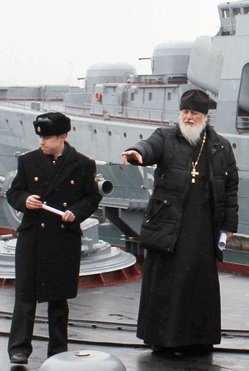 - Духовенство и флот связывают добрые традиции. На кораблях русского флота до 1917 года было военно-морское духовенство. Интересно, что прямо на кораблях были храмы и в них могли совершаться практически все Таинства и службы – священники исповедовали моряков, совершали Литургию, молебны. И в музейной комнате крейсера «Варяг» мы найдем немало документов, рассказывающих об окормлении флота, а также о том, что традиции эти возрождаются. Так, правящий архиерей Владивостокской епархии владыка Вениамин уже несколько раз участвовал в морских походах на боевых кораблях Тихоокеанского флота – на крейсере «Варяг», на БПК «Адмирал Виноградов», совершал прямо в море Крещение моряков.